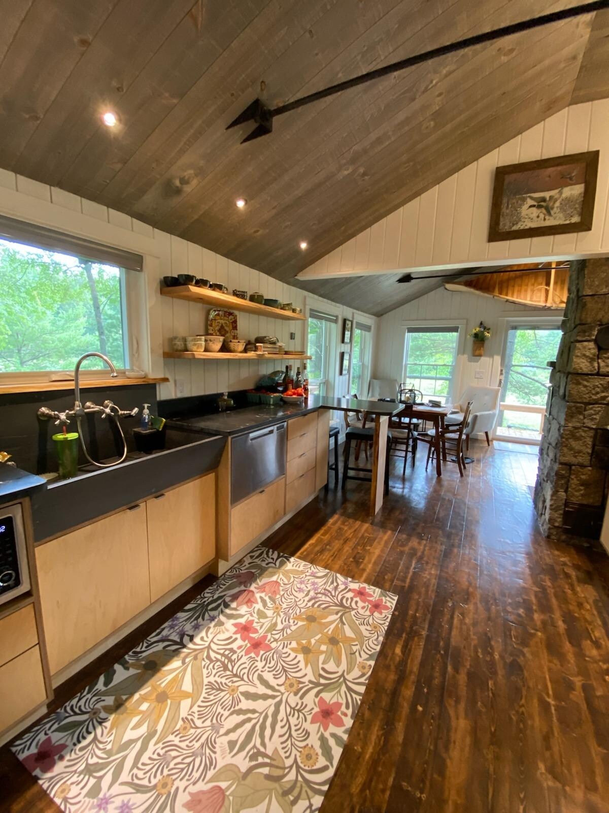 Tranquil cabin; open plan. Bedroom w/queen bed & privacy doors. Alcove w/bunkbeds. The Cabins at Currier Landing, featured in Dwell as “Three Magical Tiny Cabins Take Root in a Maine Forest,” are located on the Thos. Currier Saltwater Farm. Glimpses of water & access to 300’ of the Benjamin River Harbor shore. 2 seasonal cabins; 1 studio cabin. Centrally located on the Blue Hill Peninsula near Deer Isle, the cabins offer access to outdoor activities, cultural events, restaurants & shops.