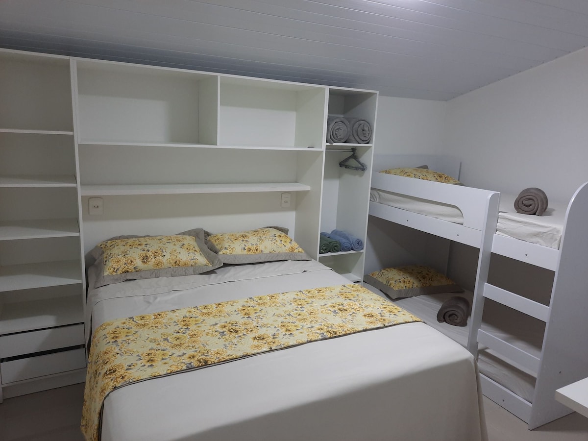 Omfavn enkelheten på dette rolige stedet, som ligger ved siden av sentrum. Ideelt for de som er på gjennomreise i regionen. Plass til to personer. 1 queen size-seng, 1 skrivebord, 1 bad, 1 minibar. Det har ikke internt kjøkken, men det er mulig å bruke utendørs kjøkken med grill (fellesområde). Med overdekket garasje. Merk. Gjestenes plass er på samme tomt, ved siden av hovedhuset, men med privatliv. 3,5 km fra sentrum av Blumenau,