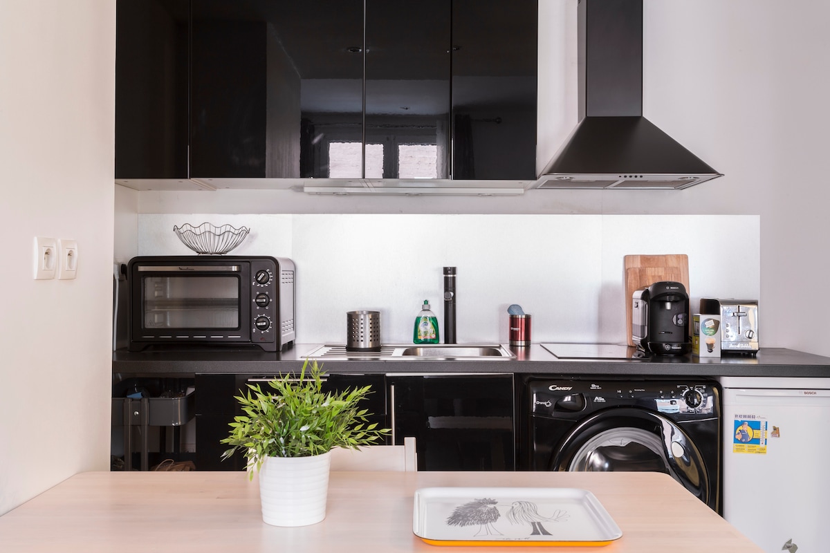 Sjarmerende studio på 18 m², fem minutter fra Louvre🖼️, ideelt for to gjester. Den har to modulære enkeltsenger (adskilt for venner/romkamerater eller kombinert som dobbeltseng for par💕), et fullt utstyrt kjøkken, raskt trådløst nettverk og et praktisk bad. Den ligger i første etasje i en vakker, gammel bygning (enkle trapper, ingen heis), og tilbyr komfort og autentisitet i hjertet av et livlig nabolag, i nærheten av kaféer, restauranter og butikker. ✨