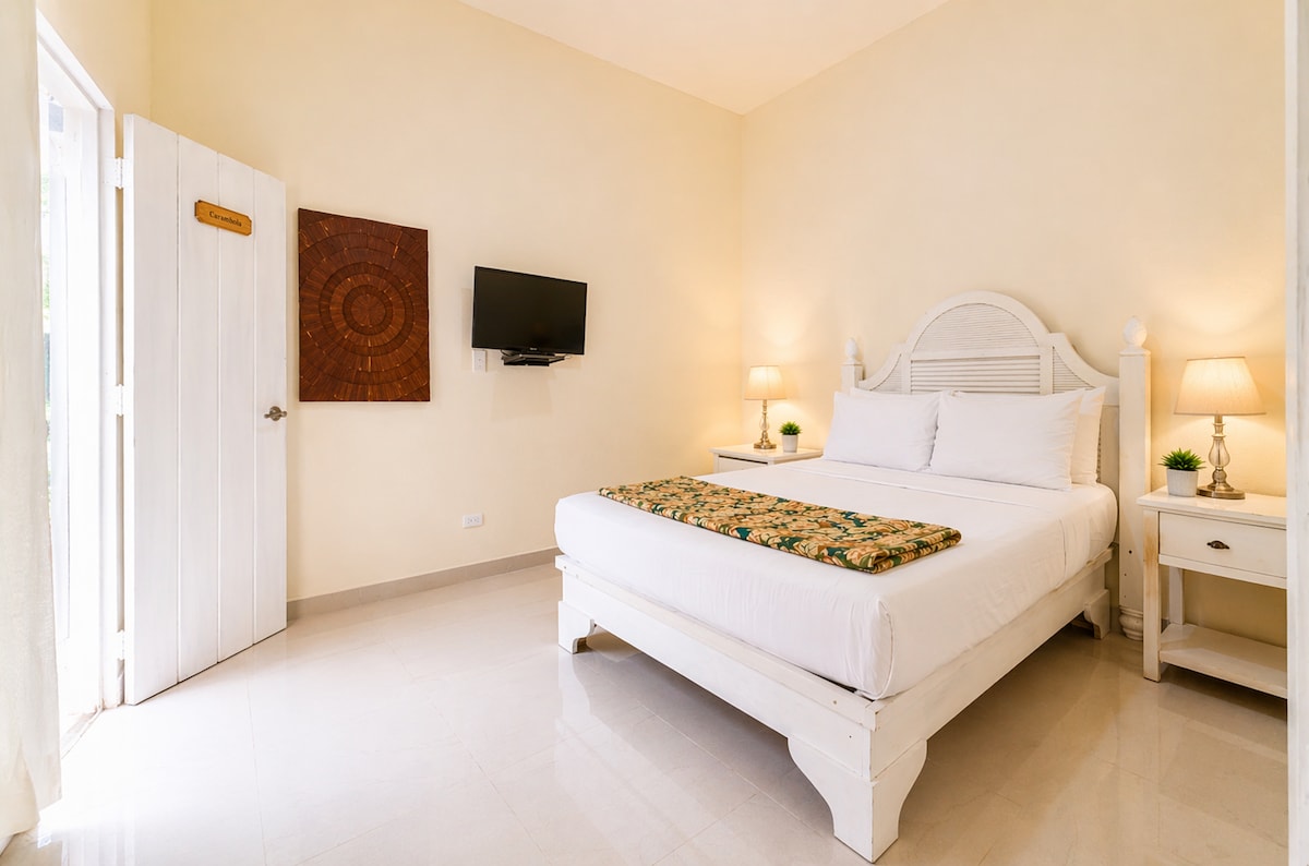 Koselig og rolig rom som ligger i leilighetshotellet vårt foran stranden i Juan Dolio, designet for en avslappende ferie. Den har klimaanlegg og trådløst nettverk, og tilbyr et komfortabelt og funksjonelt miljø. Ideell for familier, par eller vennegjenger som ønsker privatliv, komfort og en førsteklasses beliggenhet ved havet, med enkel tilgang til stranden og områder designet for å nyte et hyggelig og problemfritt opphold.