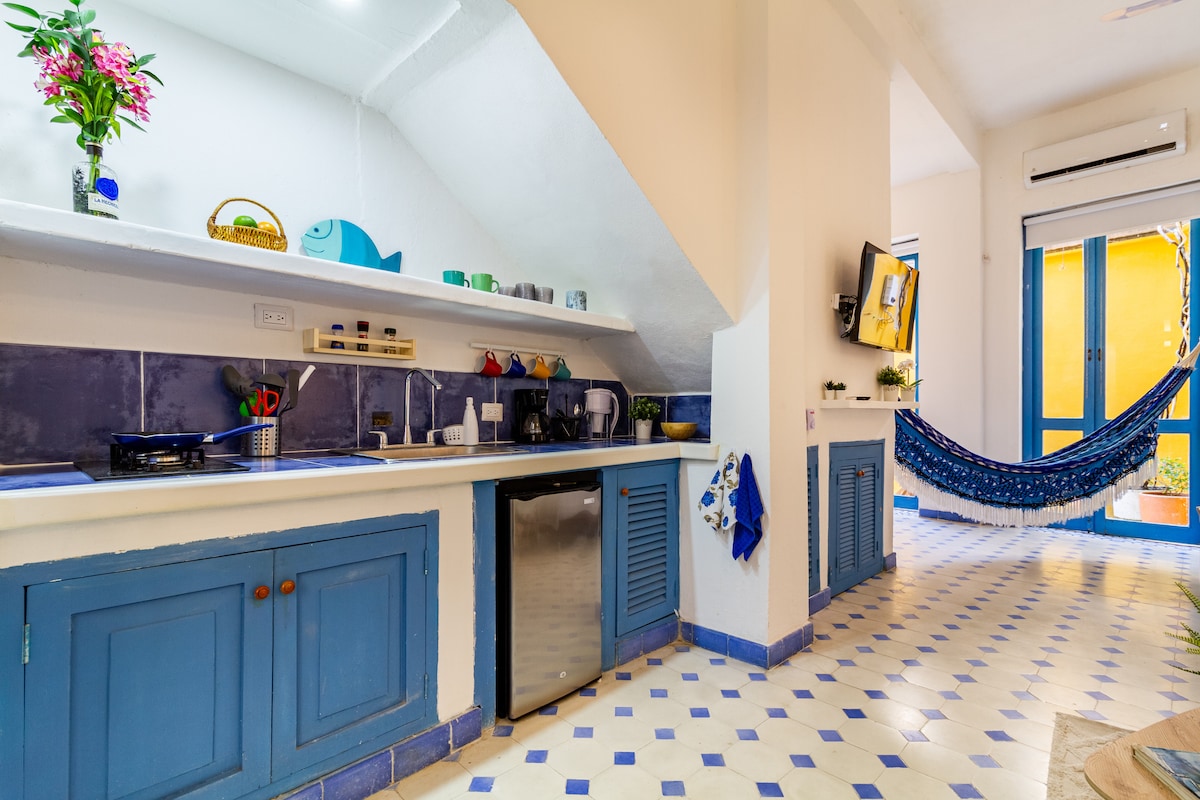 Loftssuite med ett soverom i hjertet av Cartagena, inspirert av noen av de fineste femstjernershotellene i verden. Beliggende innenfor murene til gamlebyen, innenfor gangavstand til butikker, underholdning, restauranter, nattklubber og barer. Nyt et opphold i denne Unesco Heritage-byen, som er full av historie og spenning. Fullt utstyrt kjøkken med vaskemaskin/tørketrommel, kingsize-seng, uttrekkbar queen size-sofa, TV, Netflix og 300 Mb trådløst nettverk. Den moderne leiligheten vår med strandstemning er perfekt for et par som vil nyte og slappe av.