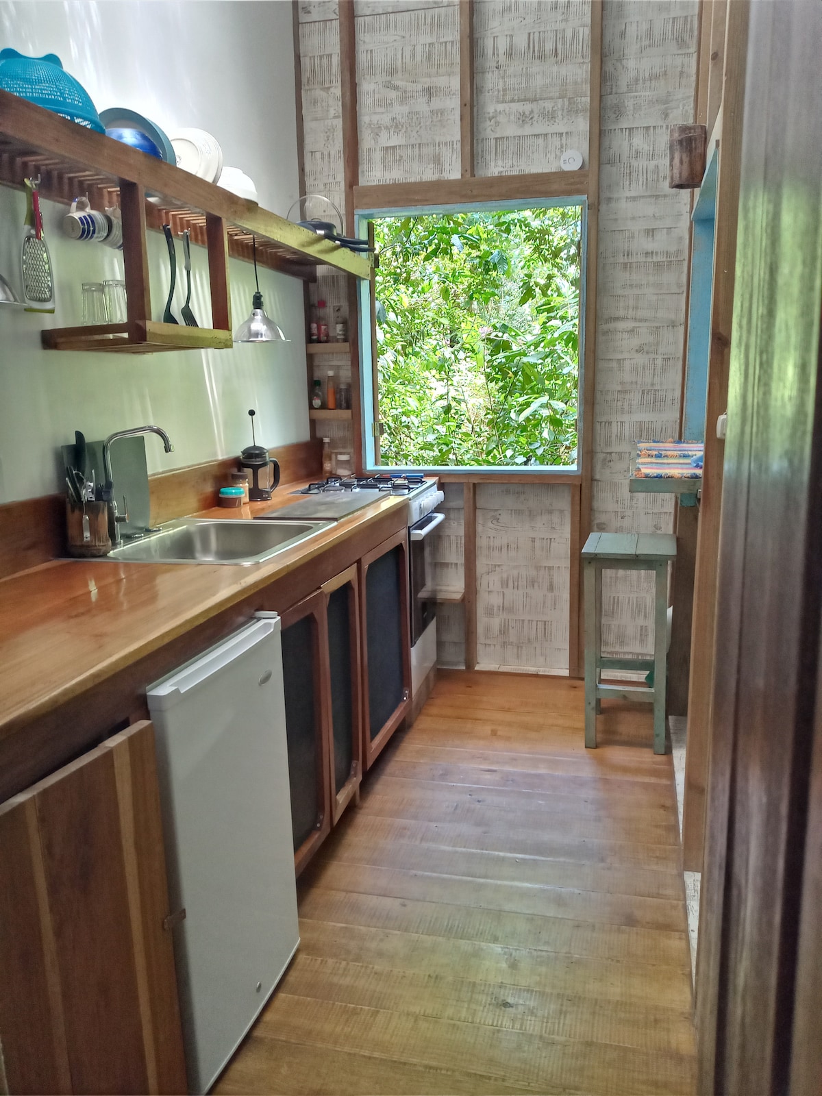 Dette lille hjemmet i moderne stil ligger i vakre jungelomgivelser. Nyt aper og fugler fra din luksuriøse kingsize-seng, sofa eller to enkeltsenger i vårt hvelvete loft med utsikt og soveområde. Unngå varmen og insektene med vårt AC-avkjølte innendørsområde. Et skjermet kjøkken med apparater for å tilberede nesten alle måltider. Og et flott bad med privat utendørs dusj for å virkelig nyte naturen. Vi har spill, bøker og en smart-TV for å holde deg opptatt på regnværsdager. Kos deg!