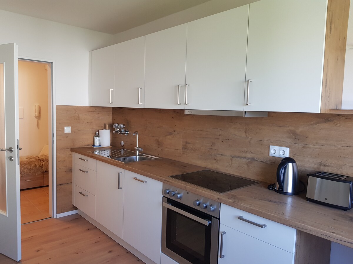 Denne svært godt utstyrte, moderne leiligheten med over 100 kvadratmeter (1 076 kvadratfot) boareal ligger i et tofamiliehus med en stor terrasse og en veldig stor hage. Leiligheten ligger i den idylliske bygden «Maria Thalheim». Der finner du et bakeri (med dagligvarer), en slakter og en italiensk restaurant med ølhage i umiddelbar nærhet. Om sommeren inviterer den naturlige badeinnsjøen (gangavstand) deg til å bade og slappe av.