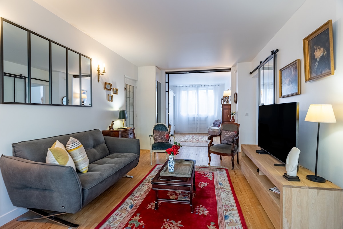 Leilighet på 75 m², nær Seinen ved Portes de Paris. Ideelt for familier, par, venner eller forretningsreiser. Du finner: et soverom med dobbeltseng, et soverom med dobbeltseng og et skrivebord, atskilt fra stuen med en japansk skillevegg, en stue, et kjøkkenhjørne, en veranda med spiseplass, et bad med dusj, et separat toalett og en hage. Leiligheten er utstyrt med en Nespresso-maskin, høyhastighets Wi-Fi og mange fasiliteter.