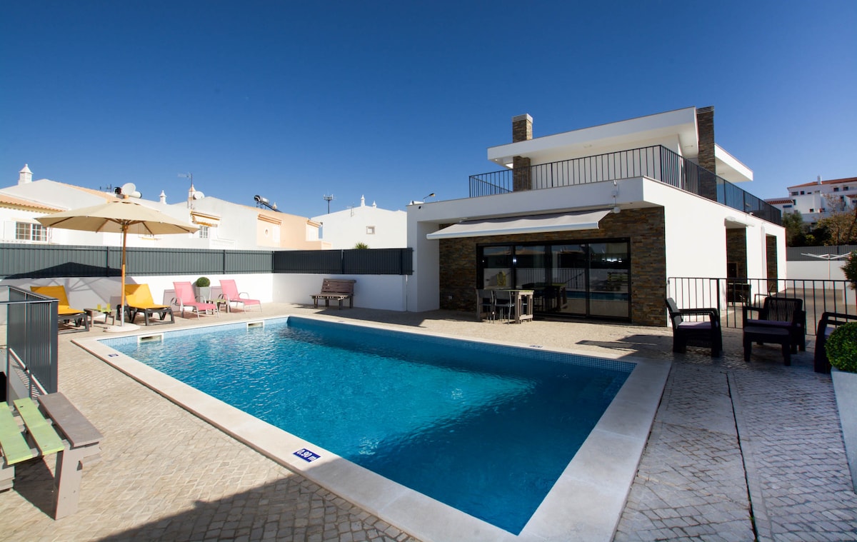 Fantastisk villa på landet, to minutter fra Armação de Pêra-stranden. Svært privat og rolig. Klimaanlegg på de tre soverommene. Grill for å lage ditt eget grillkjøtt eller fisk. Det er et stort svømmebasseng, mange trær og blomster i avslappende omgivelser. Du kan nyte solen i Algarve.