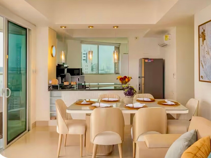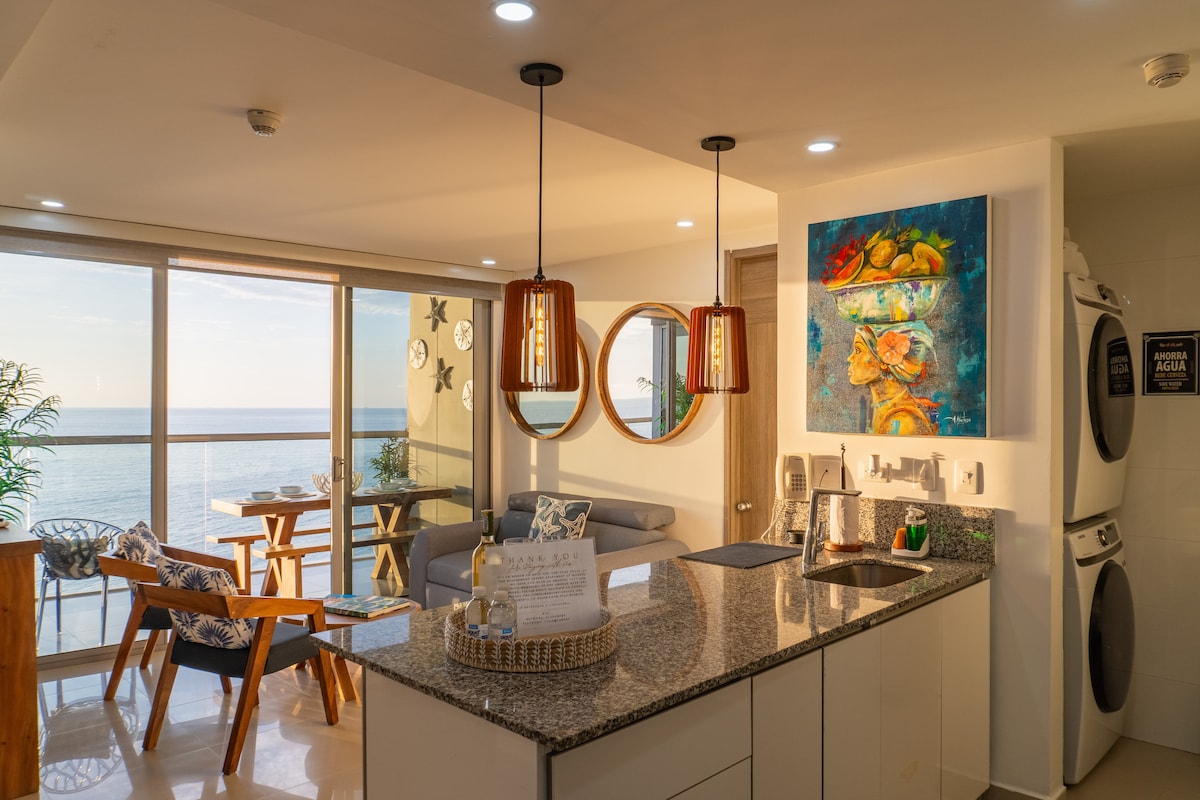 ✨ Velkommen til ferieboligen din i Cartagena: en luksuriøs leilighet i en høy etasje med utsikt mot havet, med to private balkonger og 180° panoramautsikt over Karibien og bukten. Den er designet for komfort, og har en moderne stue med vinduer fra gulv til tak, et fullt utstyrt kjøkken, raskt trådløst nettverk og digital innsjekking. Nyt evighetsbassenget, bassenget og treningsstudioet med havutsikt. Ligger i Bocagrande, noen skritt fra stranden og minutter fra Walled City. 🌊🌴