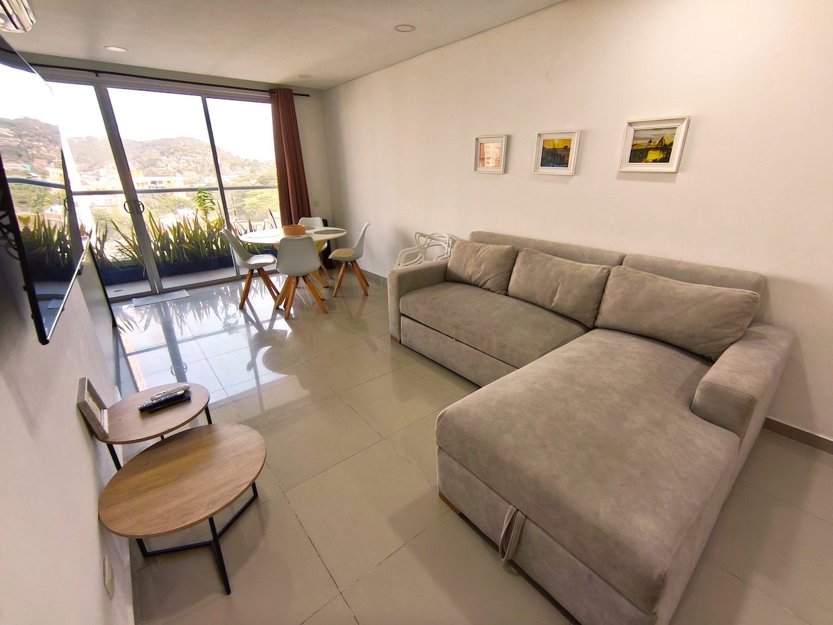 Nyt en elegant leilighet ved havet i Bocagrande, med direkte utsikt over Karibia. Den har to soverom, to bad, en stor stue med sovesofa, et fullt utstyrt kjøkken, raskt trådløst nettverk og en privat balkong med en hengestol. Klimaanlegg i alle områder. Perfekt for familier og grupper som ønsker komfort, en førsteklasses beliggenhet og umiddelbar tilgang til stranden. Alt er designet for et moderne, praktisk og avslappende opphold.