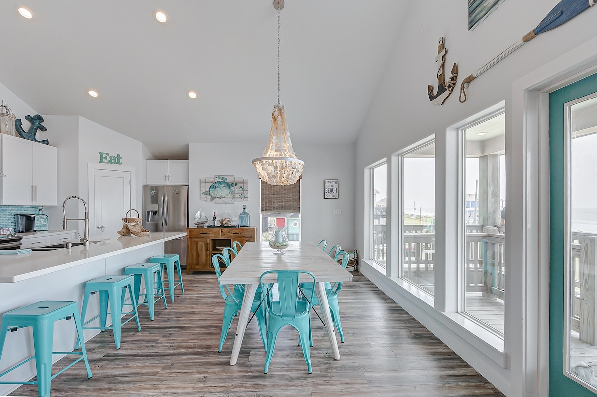 SEASIDE PARADISE er det perfekte hjemmet på stranden ved gulfen langs kysten. Dette ønskelige spesialbygde hjemmet ligger i den ettertraktede smaragd 2 underavdelingen og ligger sentralt til restauranter, dagligvarebutikk og alle aktiviteter som Crystal Beach har å by på! Det er det ideelle stedet for å slappe av, underholde og nyte utsikten over bukten og brisen. Sekunder fra tilgang til stranden og god plass til å nyte og slappe av i den store mesaninen utstyrt med et stort utekjøkken, inkludert en tresidig bar.