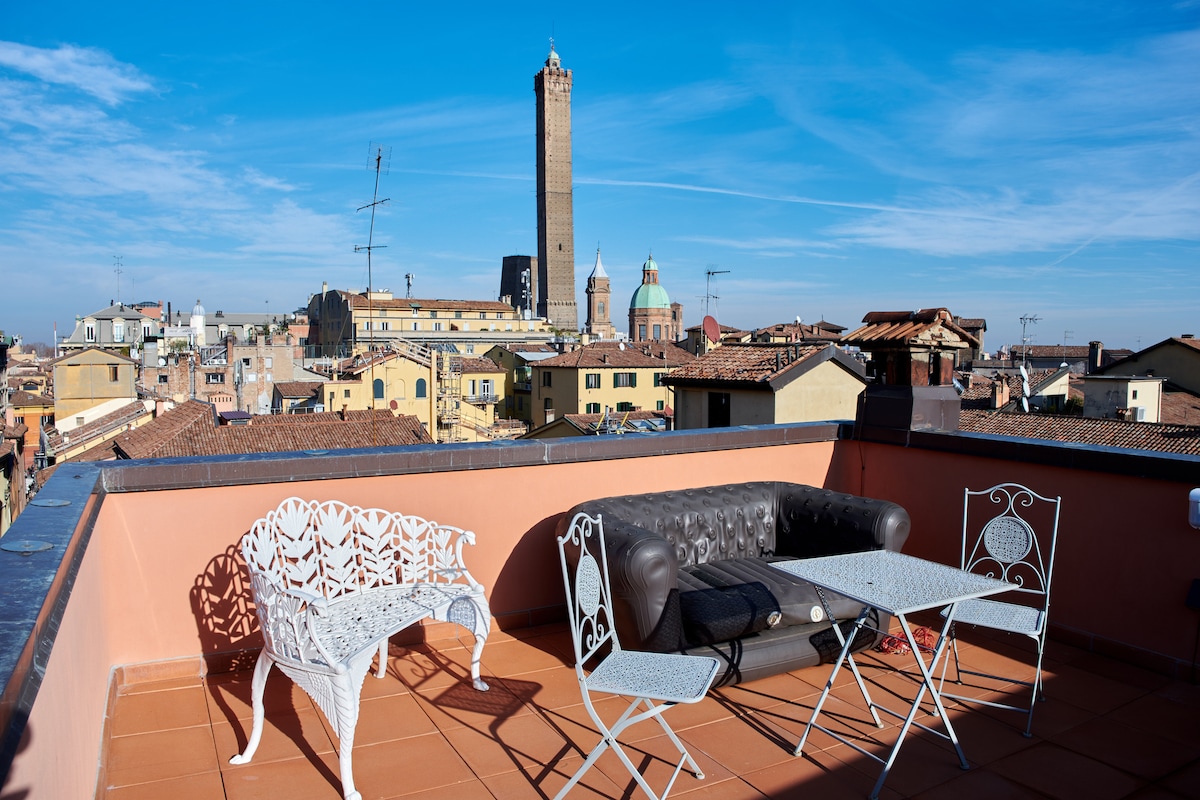 Topetasje med utsikt over de to tårnene, fem minutter fra Piazza Maggiore