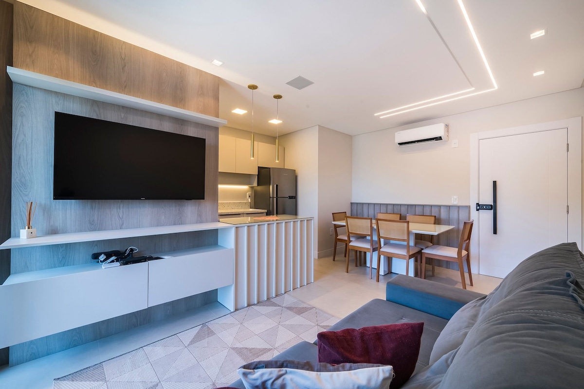 Ny leilighet i sentrum, nær Bombinhas-stranden. Denne leiligheten har to soverom, som er: 1 suite med dobbeltseng og aircondition Ett soverom med to enkeltsenger og to ekstra enkeltsengemadrasser og aircondition Integrert stue og spisestue Kjøkken med utstyr og serviceområde med vaskemaskin. Balkong med grillplass og udekjørte garasjeplasser for 2 biler. Leiligheten har svømmebasseng og treningsstudio.