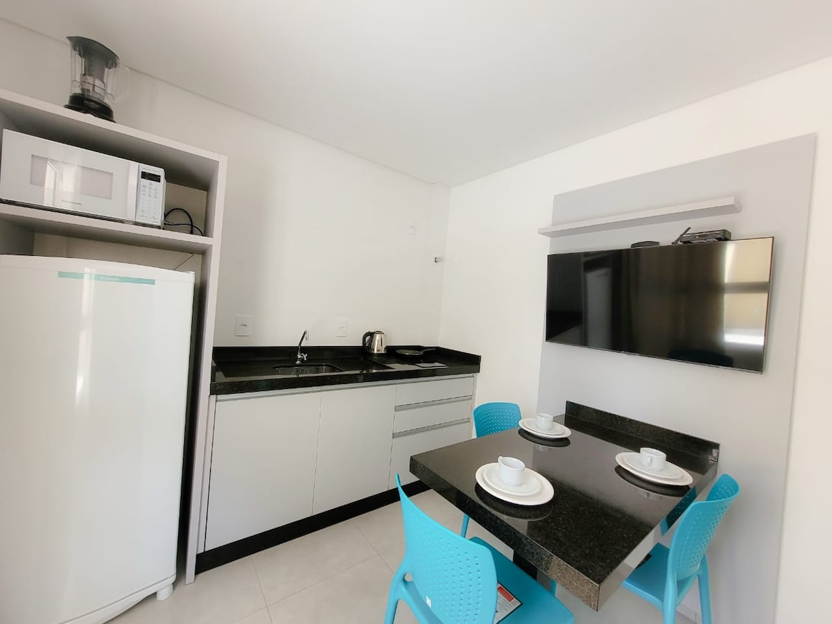 Denne moderne leiligheten ligger bare 120 m fra Bombas-stranden og tilbyr komfort og praktiske løsninger for opptil fire gjester. Den har ett koselig soverom, en integrert stue med TV, et utstyrt kjøkken og et fullt utstyrt bad. Funksjonelle og godt innredede omgivelser, ideelle for avkobling etter en dag på stranden. Flott beliggenhet, i nærheten av markeder og restauranter, og med enkel tilgang til de viktigste stedene i Bombinhas. Perfekt for deg som ønsker ro, bekvemmelighet og nærhet til havet.