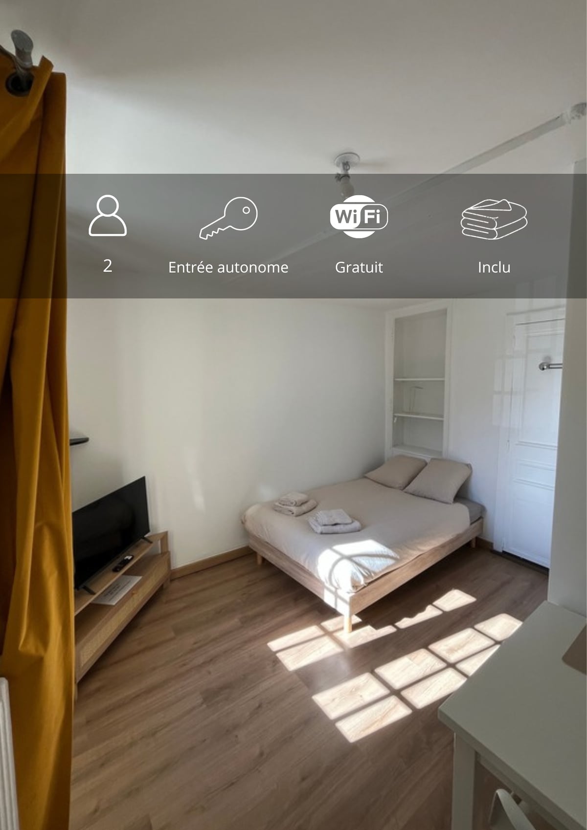 Velkommen til hjemmet vårt, så hjemme! Lite studio i huset, uavhengig av husets liv og isolert fra byens ytterlyd. Det er en ekstra seng tilgjengelig. Hvis du vil ha en tredje seng, tilbyr vi deg en madrass på gulvet. Gratis parkering er gratis foran huset. Kjøkken, kaffe, te, urtete, madeleiner, vannkoker, kjøleskap, mikrobølgeovn, induksjonstopp, kjøkkenutstyr.