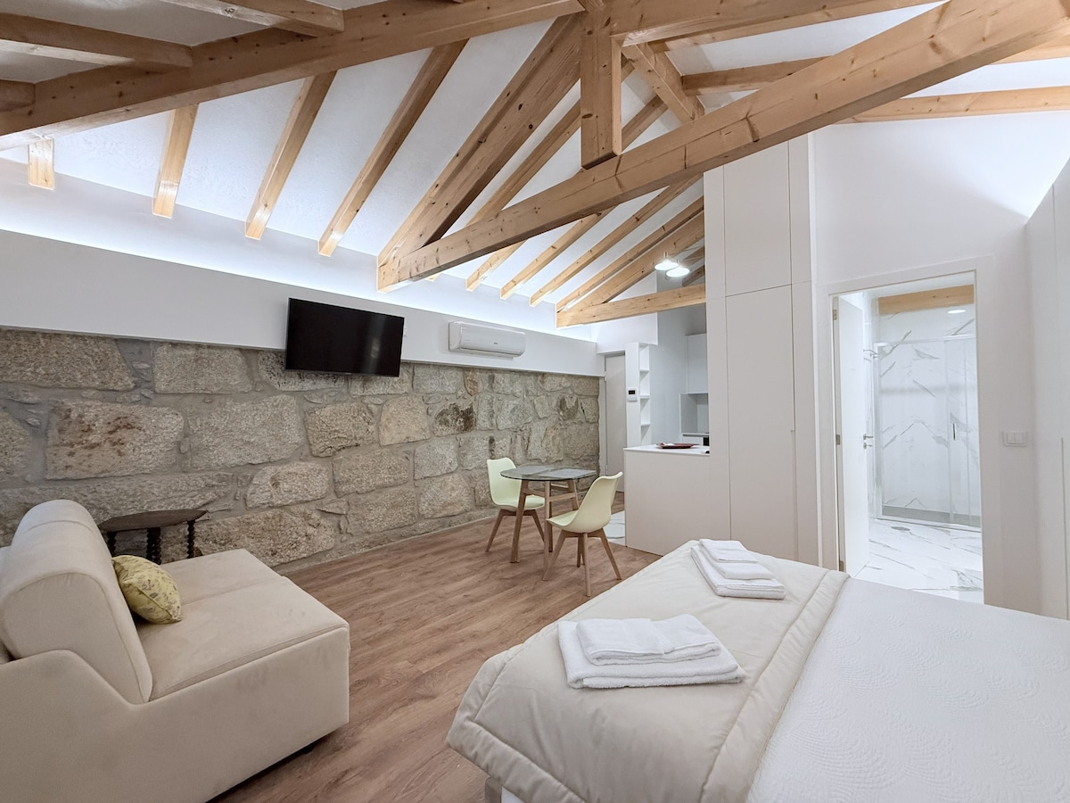 Apartamento perfeito para duas pessoas. É um apartamento novo de um edificio centenário e reabilitado que mantem a traça original que o caracteriza e embeleza. Está situado na próximidade da baixa da cidade e a 5 minutos da principal estação de comboios e de metro. Usufrua de uma estadia num apartamento moderno, charmoso e tranquilo, decorado de forma a proporcionar o aconchego e sossego que procura. O espaço exterior, a varanda, permite-lhe usufruir das refeições com serenidade.