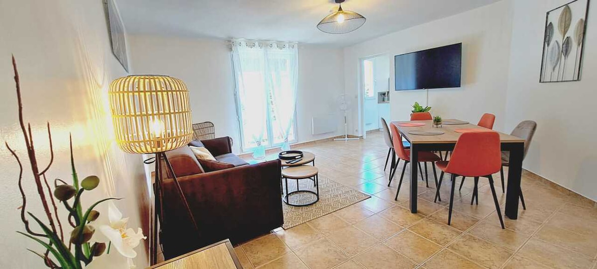 Du vil være i en varm og koselig bolig på 50 m2 Plassert i et frittstående hus med egen inngang, veldig rolig, i første etasje med tilgang til utemøbler slik at du kan spise ute og slappe av i skyggen av et kirsebærtre, med utsikt mot fjellene. Stor parkeringsplass Rask tilgang til sentrum: alle butikker, mediebibliotek, slott, kino, svømmebasseng ..