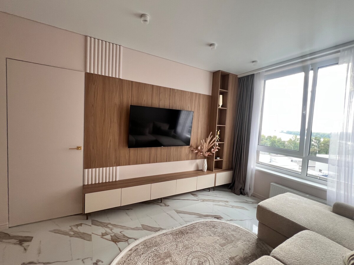 Vi inviterer deg til vår nye leilighet med to soverom i moderne stil i det nye komplekset "Slavutich", renovert i 2023. Slavutich 2 Residential Complex, Zarichnaya, 6 bygning 1, etasje 3, 2 minutters gange fra T-banestasjonen "Slavutich". Nær elven Dnipro og stranden. Huset har ly. For to voksne + barn. Det er en generator i huset (når lyset er slått av, heisen fungerer, lys i fellesområdene i huset, kaldt vann, oppvarming, internett (du trenger en bank for en ruter), varmt vann oppbevares en stund i kjelen.)