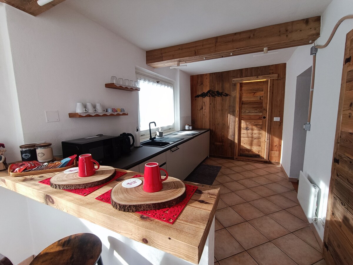 Besteforeldrenes hus ligger i Alpetta, et par skritt fra landsbyens hjerte i Valle Soana. I første etasje består den av et stort og solrikt kjøkken, et lyst soverom med utsikt over den grønne engen, et bad med dusj, en lang panoramisk balkong i full sol hele dagen hvor du kan slappe av og beundre solnedgangen over Gran Paradiso-fjellene. Leiligheten er utstyrt med TV, kjøleskap med fryser, ovn og tørkestativ på balkongen, pelettovn...