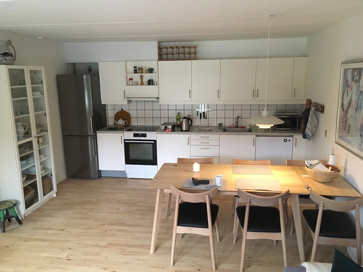 Ombygd atelier med mye lys og luft. Leiligheten er innredet som ett stort rom over 2 plan, men badet er separat. Beliggende på en rolig boligvei i Aarhus C. Kjøp av parkeringsplass kan bestilles. Nabo til Universitetet, Handelshøyskolen, Gamlebyen og Botanisk Have. Her er alt du trenger for et kort eller langt opphold. I gangavstand til det meste. Lett å komme til med kollektivtransport. Utgang til egen terrasse. Ikke egnet for barn, da boligen ikke er barnesikret.