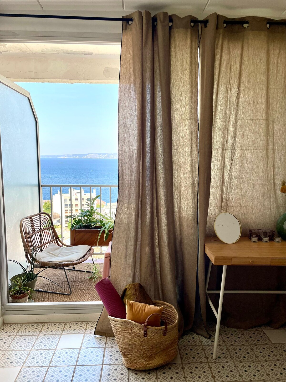 På veien til Calanques, leier vi en hyggelig leilighet på 85 m2 i 3. og øverste etasje i en bygning med 6 leiligheter UTEN HEIS med en vakker terrasse og en veldig fin utsikt over havet og Cap Canaille i et sikret boligområde. Du har to soverom og to bad. Du har en garasje for bilen din. Leiligheten ligger 5 minutters gange fra Bestouan-stranden og 10 minutter fra sentrum av Cassis.