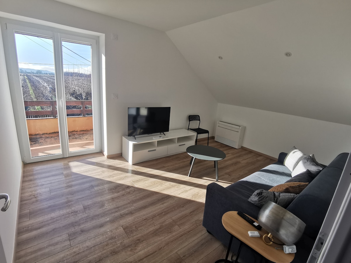 Møt opp i denne fredens oase ovenpå, ideelt for et opphold i fullstendig uavhengighet. Rommet på 25kvm vil forføre deg med en queensize-seng på 160x200 og den koselige atmosfæren. Sitteområdet og SPAET er perfekt for avslapning etter en dag med sightseeing. fasiliteter: mikrobølgeovn, kaffemaskin, kjøleskap Flatskjerm-TV Trådløst nettverk Sikker privat parkering Sengetøy og sengetøy på badet er inkludert. Hjemmelaget frokost mot en ekstra kostnad på € 10/pers SPA 30 euro for 1,5 timer fra seks år og 50 euro om vinteren.