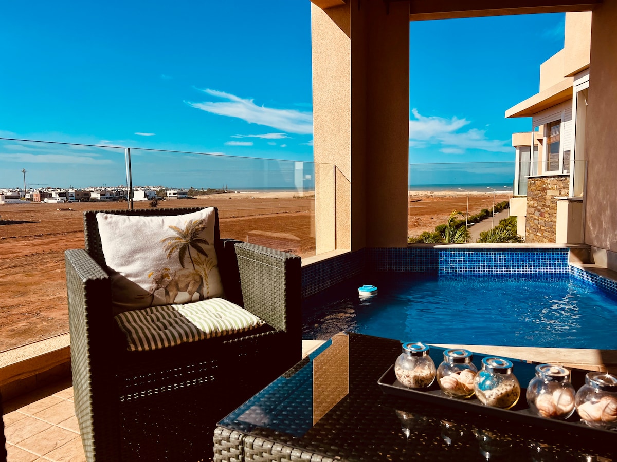 Solrik panoramaleilighet med terrasse mot havet og et lite privat basseng. Hovedsuite med TV og bad. Andre soverom med terrasse. Andre bad. Komfortabel stue, 50 tommers TV, Netflix og trådløst nettverk, utstyrt kjøkken med bar, sentralt klimaanlegg. Inngjerdet og sikker bolig med parkering og garasje. Stort felles svømmebasseng åpent året rundt. Cherrat og Bouznika-stranden ligger noen minutter unna. Absolutt rolig. Ideelt for familier og par.