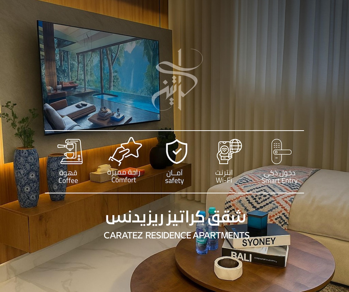 Leiligheten er designet med et moderne design og er preget av ro og fullstendig privatliv og innsjekking uten vert. Den ligger på en særegne beliggenhet i nabolaget Hateen, rett overfor Riyadh City Boulevard og i nærheten av underholdningsstedene og teaterne for Riyadh-sesongen, noe som gjør det enkelt å komme seg rundt i sesongen, og den ligger også i nærheten av alle tjenester og komplekser. Leiligheten har trådløst nettverk, og det er en smartskjerm med Netflix-abonnement og gratis VIP-klokke.
