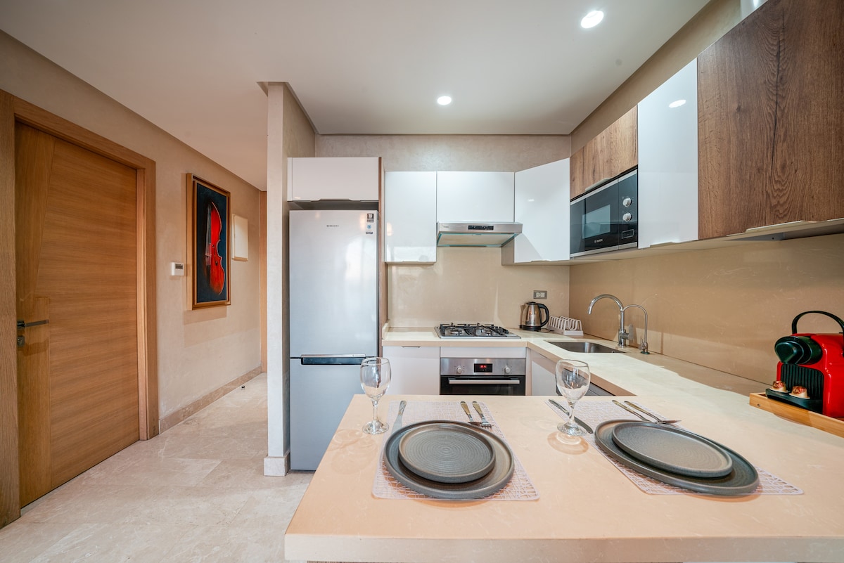 Luksusleilighet ★ ved stranden - Bouznika ★ Vil du ha et opphold med komforten til et 5-stjerners hotell til en rimelig pris? Du trenger ikke lete lenger, bestill nå! 🌟 Komfort, eleganse 🌟 Nyt en eksklusiv leilighet ideelt plassert i en sikker bolig, en kort spasertur fra stranden og de viktigste attraksjonene i Bouznika. Ultrahurtig fiberoptisk✅ tilkobling ✅ Perfekt for ferier eller jobbreiser Fredelig ✅ omgivelse, sikkerhet døgnet rundt.