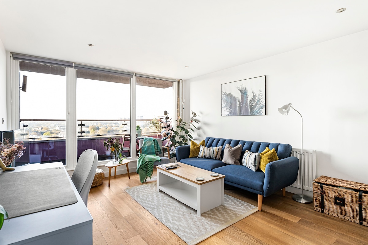 Leiligheten vår med 1 soverom og klimaanlegg er perfekt for to. Finn en innbydende stue, soverom med stor queensize-seng og HEPA-vifte, bad med eksklusive toalettartikler, elegant utstyrt kjøkken og stor, veldig grønn terrasse bare for deg å nyte etter å ha utforsket London. Nær fire T-banestasjoner, alle mindre enn ti minutters gange unna. Opplev London fra verdensberømte severdigheter, spennende nabolag, til koselige puber ved elvebredden, det er alltid et godt tidspunkt å besøke på!