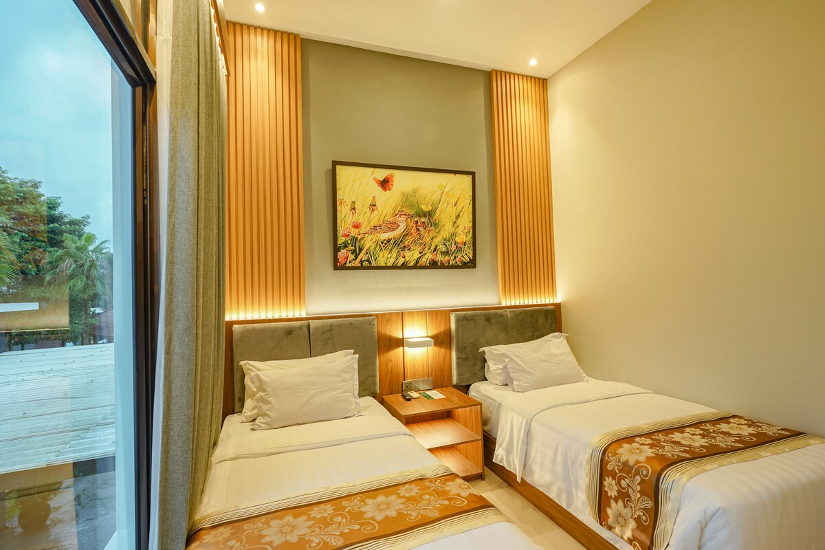 En villa og fellesområde med ett komfortabelt Deluxe-rom med utsikt til hagen, ett Deluxe-rom med basseng, felles kjøkkenkrok hvor du kan lage dine egne enkle måltider mens du slapper av i vår utendørs spisestue med dine kjære. Med strategisk beliggenhet i nærheten av byen, kulinariske destinasjoner og turistmål som Kopeng Tree Top, Dusun Semilir eller Saloka, kan du skape uforglemmelige øyeblikk med dine spesielle uten å nøle.