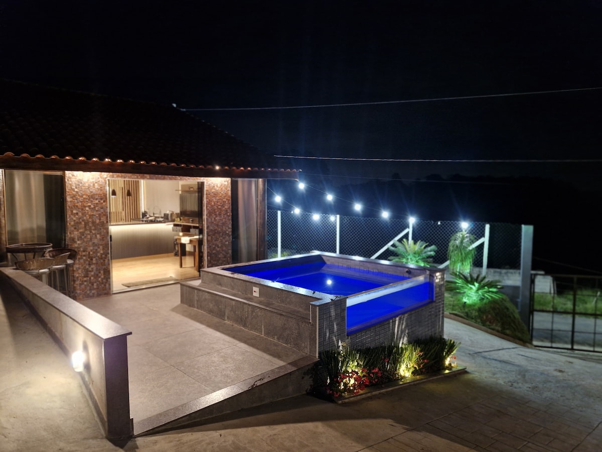 Hytte med boblebad og uendelig utsikt over dammen, ideell for å slappe av i naturen med total privatliv og sikkerhet. Perfekt for par, tilbyr den en terrasse med fantastisk utsikt, utrolig solnedgang og stjernehimmel. Nyt fuglesangen og roen når du våkner. Ligger i en marina med restaurant og turer med speedbåt, kajakk og quad, kun 1,5 time fra São Paulo, med asfaltert tilgang via Dom Pedro I-motorveien. Wi-Fi, fullt utstyrt kjøkken, klimaanlegg