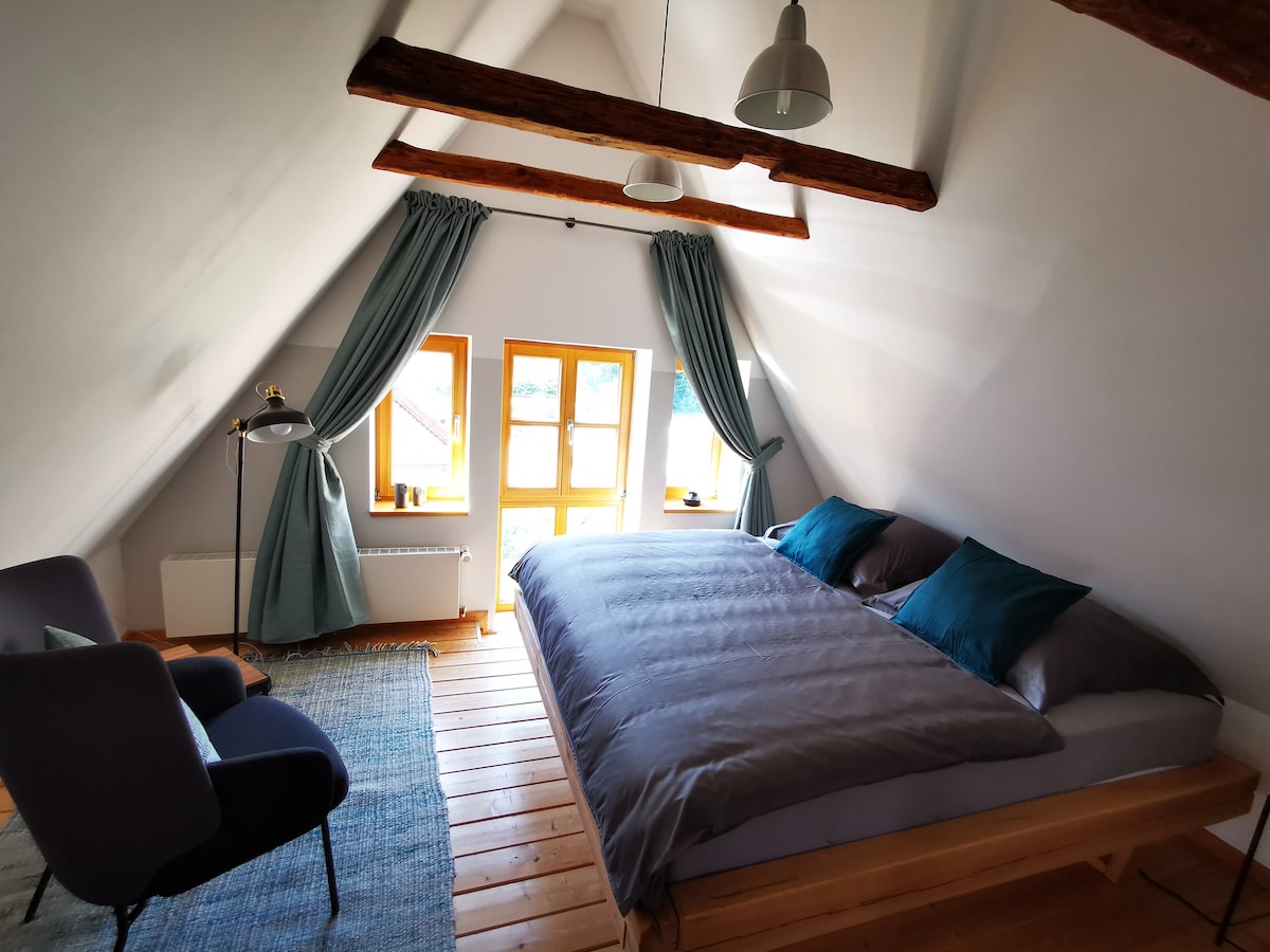 Our apartment is located in a quaint, over 100-year-old half-timbered house. The large, bright apartment is located on the 1st floor of the house, on the ground floor there is another apartment. The apartment is perfect for couples who are active but also want to relax in front of the fireplace or on the large wooden terrace. Please bring your own bed linen and towels.