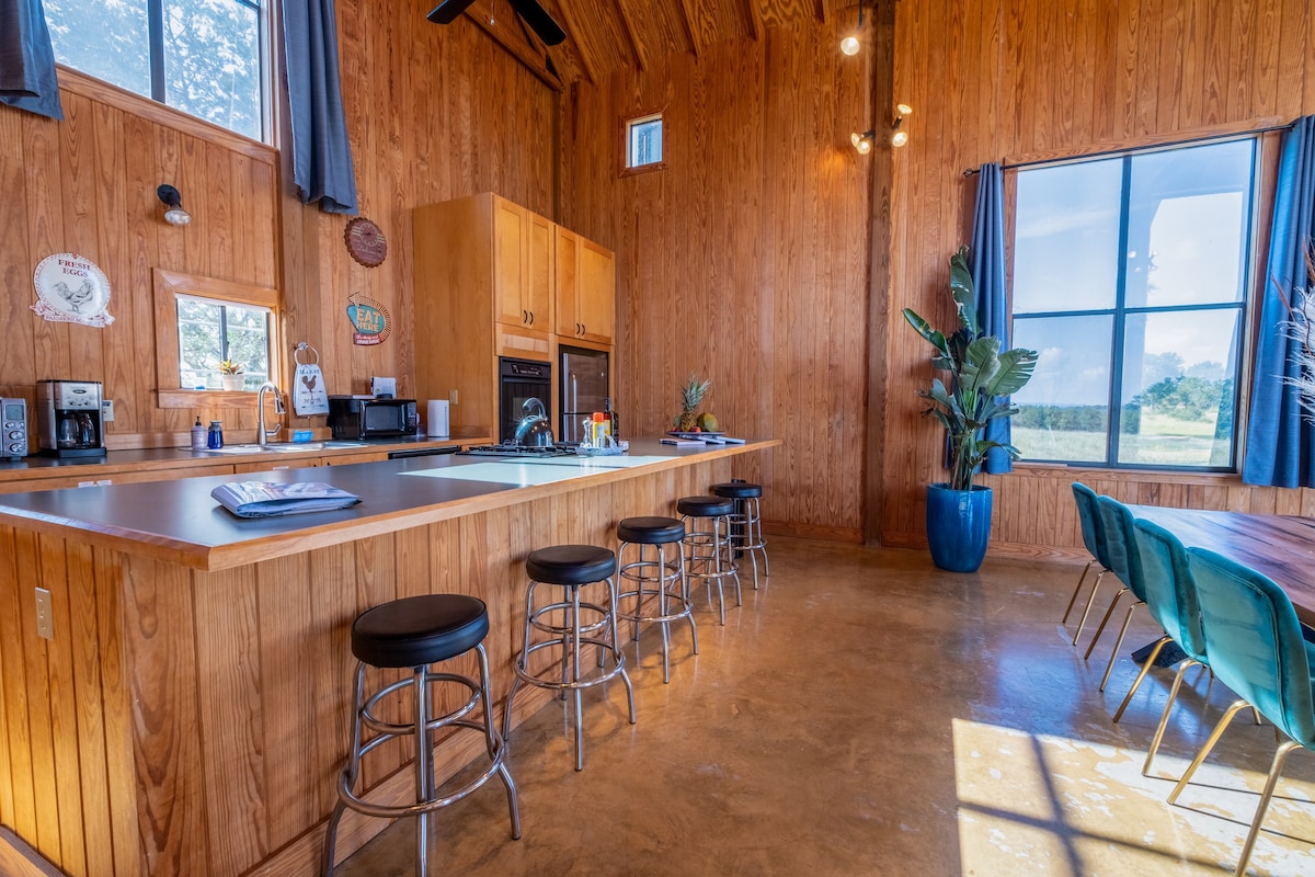 Oppdag den ultimate ferien i Texas Hill Country på den arkitektoniske låven vår, som ligger på en 60 hektar stor ranch med dyreliv. På enden av en rolig vei finner du fred, plass og privatliv – men du er bare noen minutter unna lokale vingårder. Gjør oppholdet ditt bedre ved å legge til en velværepakke og forynge deg i vår skreddersydde 16-fots vedfyrt badstue og 7-fots hybridboblebad i sedertre (elektrisk og ved). Er du interessert i å være vertskap for en sammenkomst med venner og familie, et intimt bryllup eller et fristed? Kontakt oss for å diskutere mulighetene.