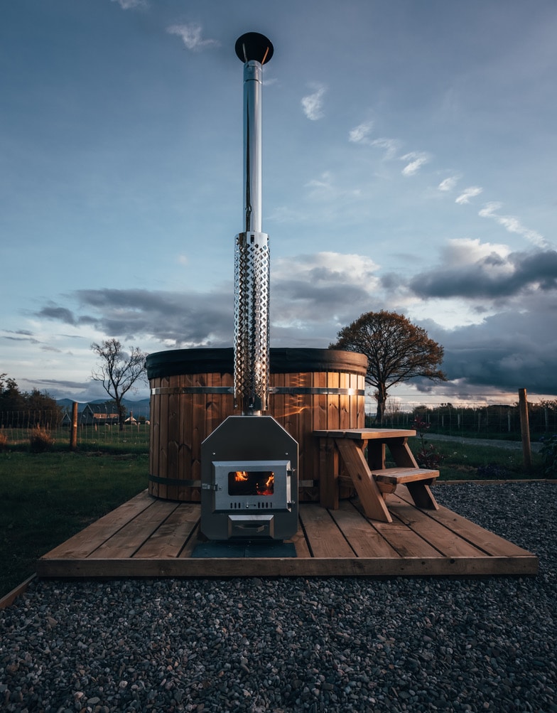 The Gambo is a traditional Shepherd's Hut with all the modern comforts you need for a relaxing break. It has a king-size bed, a fitted kitchen, full size fridge, wood-burning stove and bathroom. There is a 2-seater snuggler settee to relax and enjoy the spectacular view of the countryside and nearby coastline. Outside is a firepit, table, chairs and a Jacuzzi hot tub. Star gaze the unpolluted night sky. Relax and rejuvinate by booking a session in the sauna and cold splash pool!