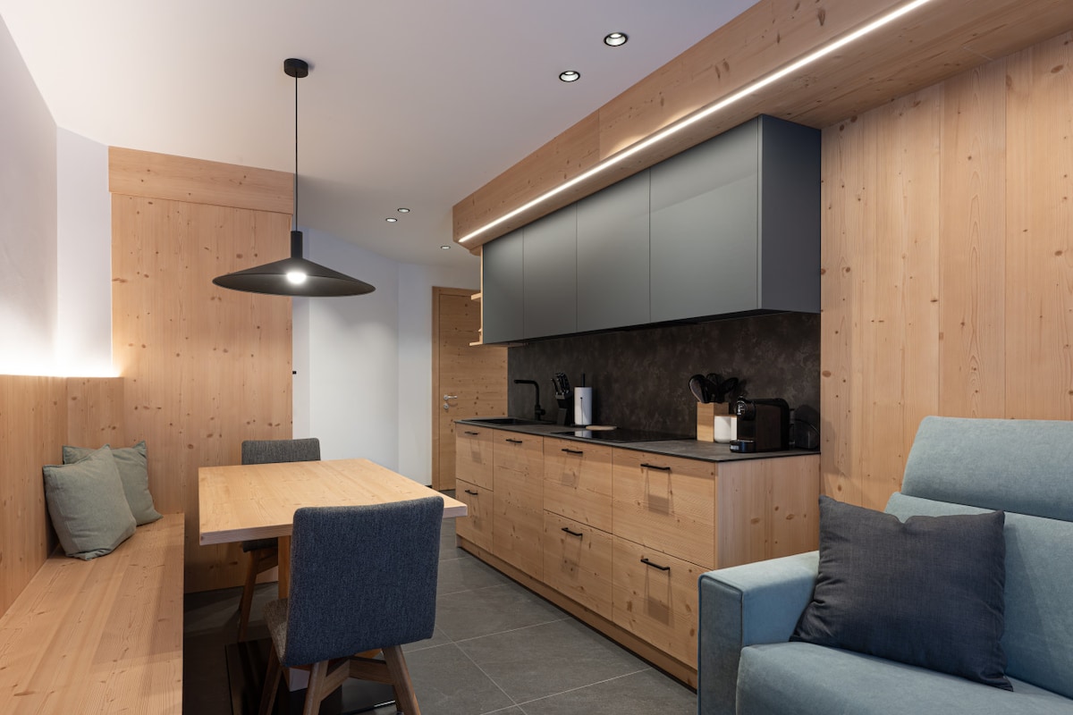 Hele toppleiligheten i to etasjer møblert i fjell-/nordisk trestil med dobbelt soverom og to enkeltsenger ovenpå, to bad med dusj og bidet. I stuen er det en sovesofa med induksjonskjøkken, bord og TV. Poggiolo med utsikt over Paganella og et stort vindu med en fantastisk utsikt mot Non Valley. Egen parkering og oppbevaring av sportsutstyr. Leiligheten ligger i andre etasje i bygningen "Mas al Doss Mountain Apartments".