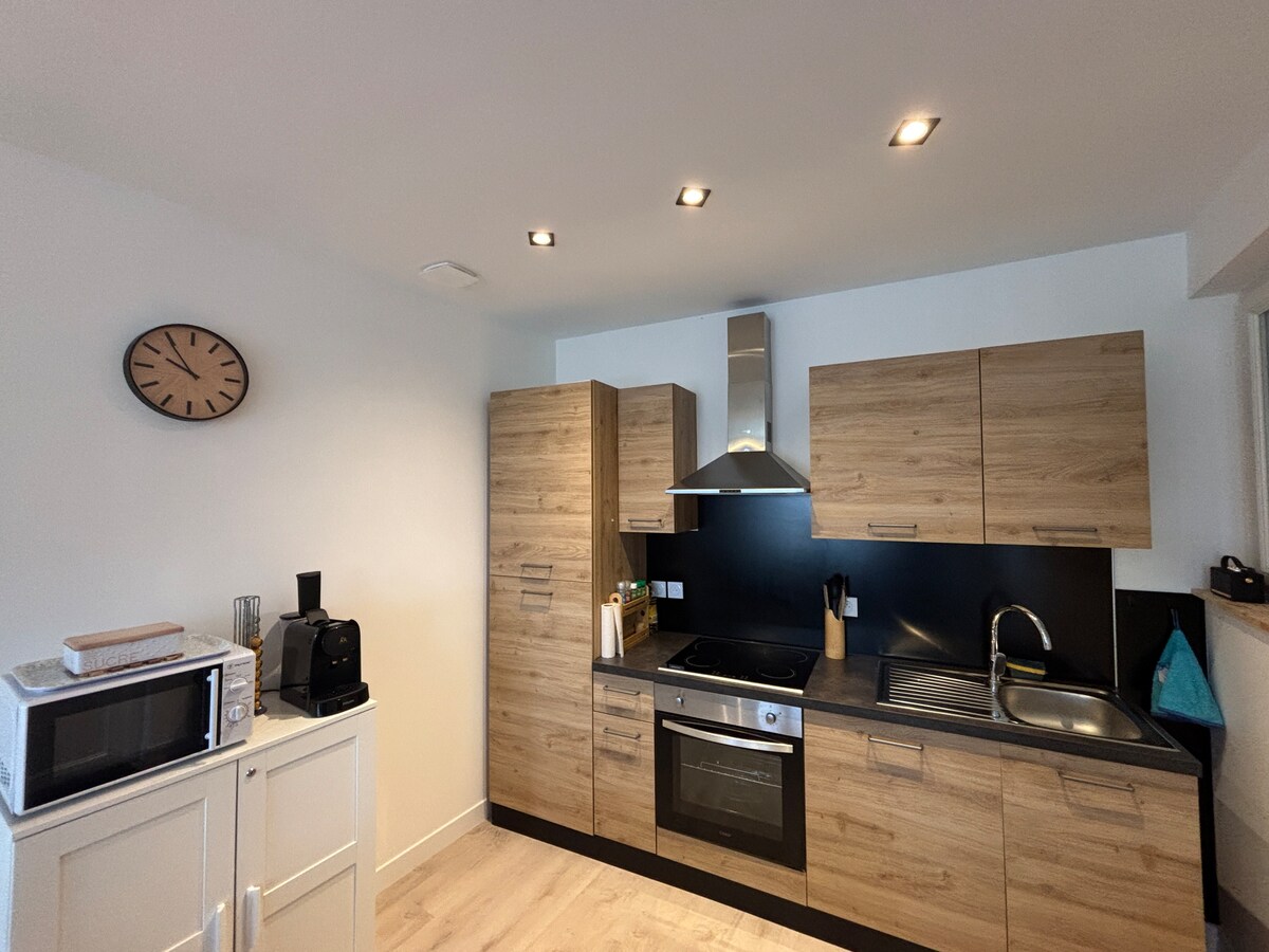 Denne 25 m2 studioleiligheten ligger i en lukket eiendom med automatisk port (kamera som ser på porten), en parkeringsplass og rolig. Den er utstyrt med et kjøkken med: mikrobølgeovn, grill, kjøleskap med fryser, elektrisk kaffemaskin, brødrister og vannkoker. Servise, bestikk og tilbehør, gryter, kjøkkenhåndklær. Soverom 1 BZ (madrass Bultex 140x190), dyne og 2 puter, TV og Wi-Fi. Vask, dusj, håndkletørker og toalett.