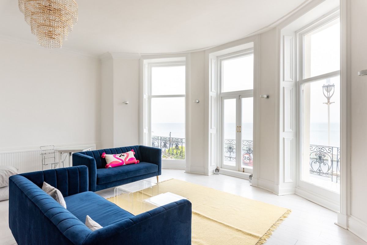 Nyt et 5-stjerners opphold ved havet i Brighton – fantastisk 180° havutsikt og balkong. Flaske med brus ved ankomst 🍾 Unngå stresset/utgiftene ved parkering i Brighton med egen parkeringsplass. I en ikonisk Regency-bygning ved stranden, en kort spasertur til bryggen eller Lanes og mange restauranter, har leiligheten alt du trenger for en flott miniferie eller et lengre opphold for par, venner eller familier. Fullt utstyrt kjøkken, badekar, himmelseng, hovedsoverom med superking eller to enkeltsenger, vaskemaskin og tørketrommel, Sky TV.