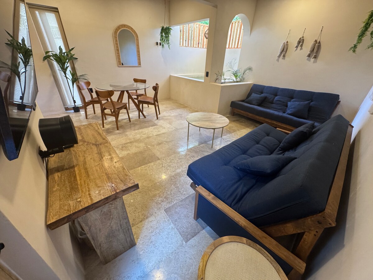 Slapp av i leiligheten vår i første etasje, ideell for én til fem gjester. Husk at vi er dyrevennlige. Du vil være i La Punta Zicatela, bare to minutter fra stranden til fots og to kvartaler fra hovedgaten, hvor du har alt for å ha det gøy og nyte atmosfæren som alltid er der, fra restauranter, barer, iskrem, butikker og alt du trenger her venter på deg. Du kommer til å elske det …