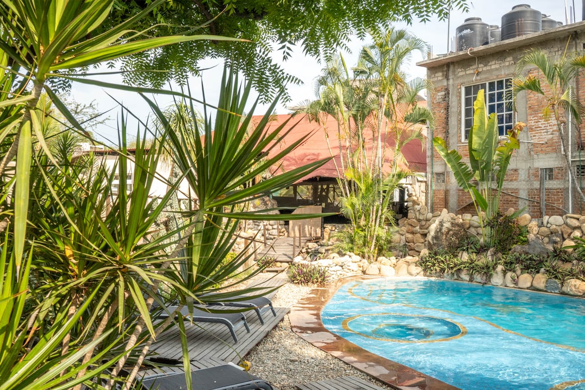 Elegant suite med queensize-seng, smart-TV, klimaanlegg, takvifte, kjøkken, bad og en forfriskende, privat boblebad. Nyt solnedgangen og slapp av mens du tenker på panoramautsikten over byen, havet og fjellene fra din private jacuzzi. Vi befinner oss i Punta Zicatela, syv minutters gange fra stranden, det viktigste surfestedet, restauranter, barer og shoppingområdet. Nært alt, men langt fra festens mas og kjas. Vi har Starlink-internett.