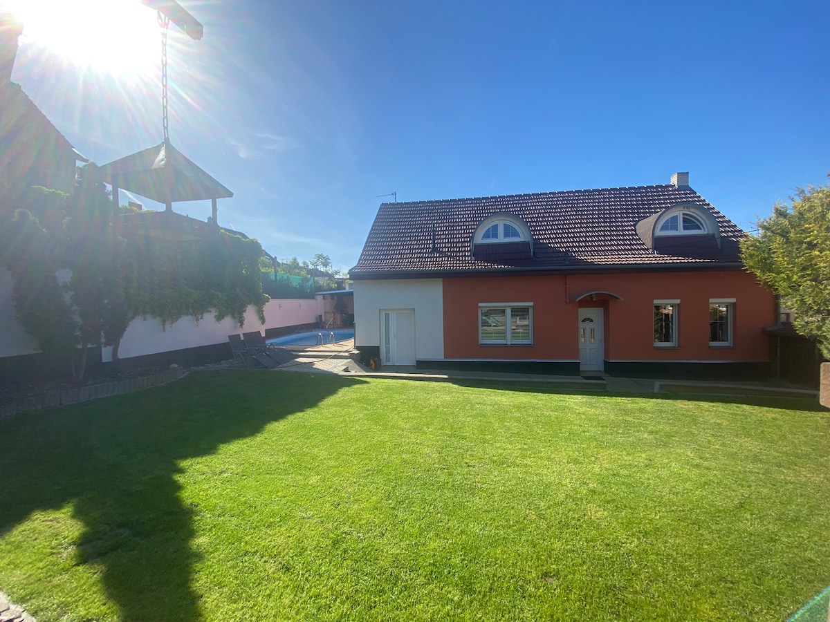 Vi tilbyr et romslig hus til leie, hvor 8 gjester kan bo komfortabelt. Det er også en barneseng og madrass. Gjestene har hele huset for seg selv. I første etasje er det en stue med aircondition, spisestue, utstyrt kjøkken med innebygde apparater, kontaktgrill, kaffemaskin. Det er fire soverom på loftet, ett av dem med aircondition. Det er to bad. Huset har delvis kjeller. Parkering er mulig ved huset eller i garasjen. I hagen er det et innendørs svømmebasseng og en overbygd terrasse med sitteplass.