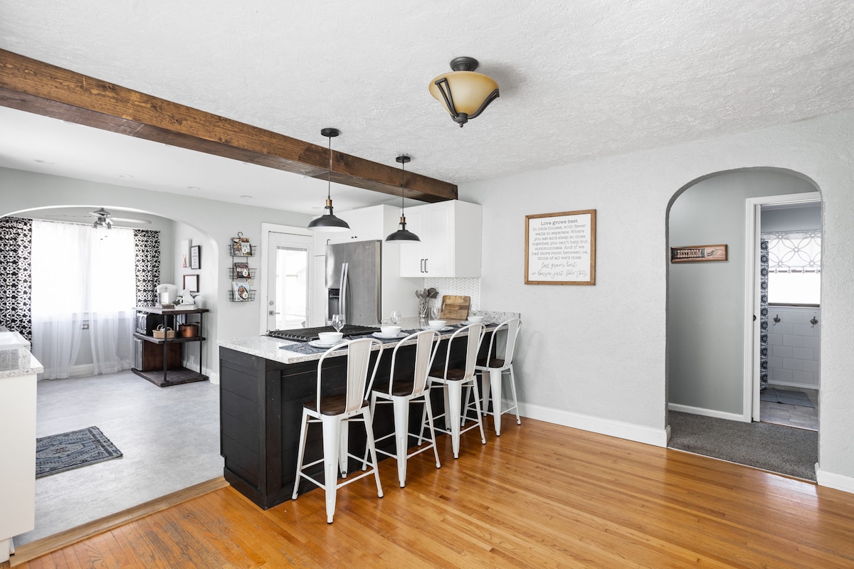 Denne Broadripple-bungalowen gjør en perfekt jobb med å blande den gamle sjarmen og karakteren til et gammelt hus med alle moderne bekvemmeligheter for å gjøre oppholdet ditt så hyggelig som mulig. Nyt morgenkaffen på den nydelige verandaen, eller et glass vin om kvelden i den sjarmerende bakgården. Dette stedet er komfortabelt innredet med gjenvunnede møbler og håndlagde gjenstander, samt ny maling overalt, noe som gir det en ren, enkel og avslappende følelse. Velkommen hjem!