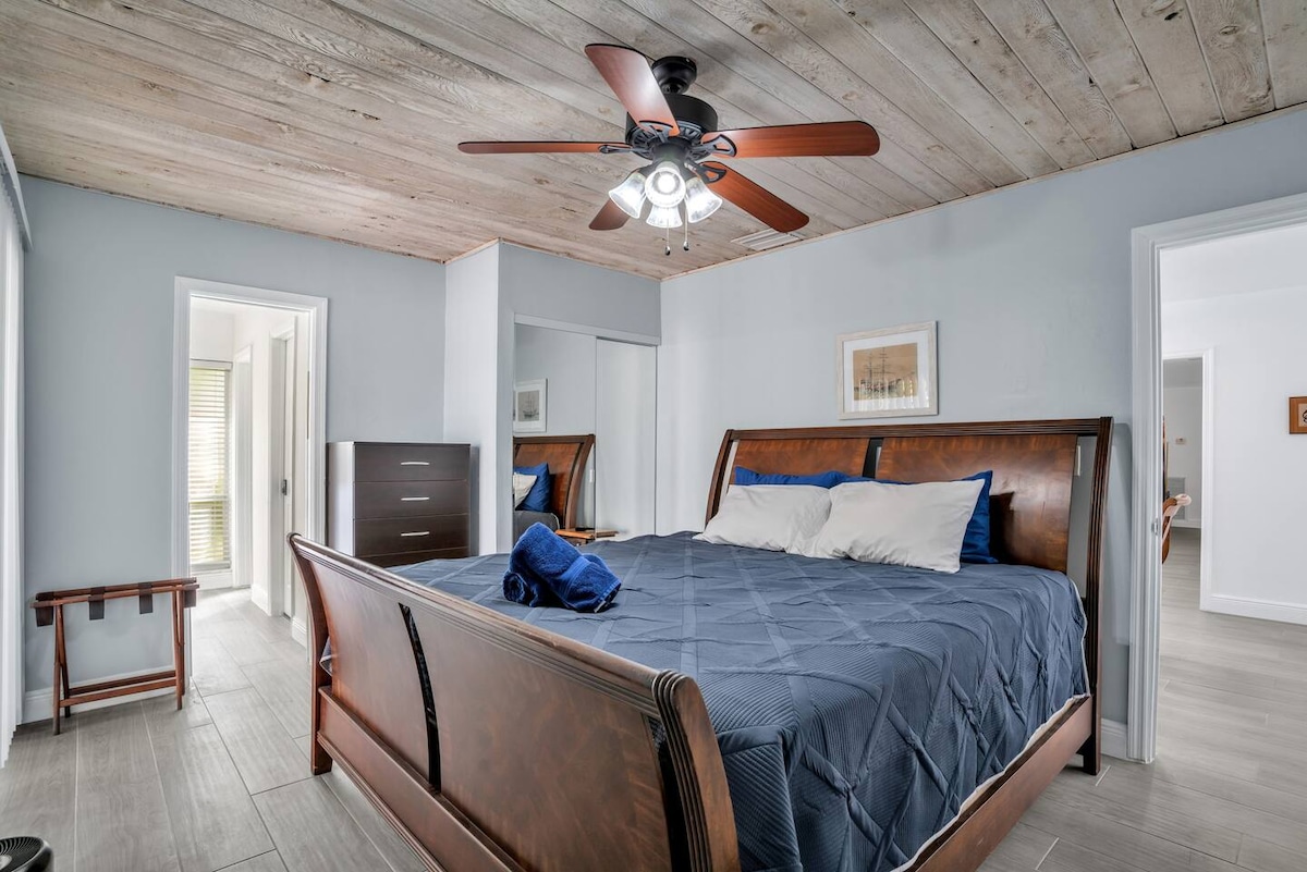 ⭐️RANGERTE BLANT TOPP 10 % AV HJEM PÅ AIRBNB 🌊Oppvarmet saltvannsbasseng (85 grader året rundt, gratis). 🌴To soverom pluss et tredje spillrom med futonseng i full størrelse og låsbare dører som et tredje rom. 🚣Gratis kajakker og padlebrett rett utenfor bryggen. 🐠 70 fot ved vannet / FISK RETT UT FRA BROEN. 🔥Tiki-hytte med bålplass og sitteplasser ute/grill. 🎯Gameroom. 🏡 Fullt ombygd hjem. 📺TV i hvert soverom. 🏝️Bare 2,5 miles til stranden! ⛱️Strandutstyr inkludert. 🚘 Fire parkeringsplasser.