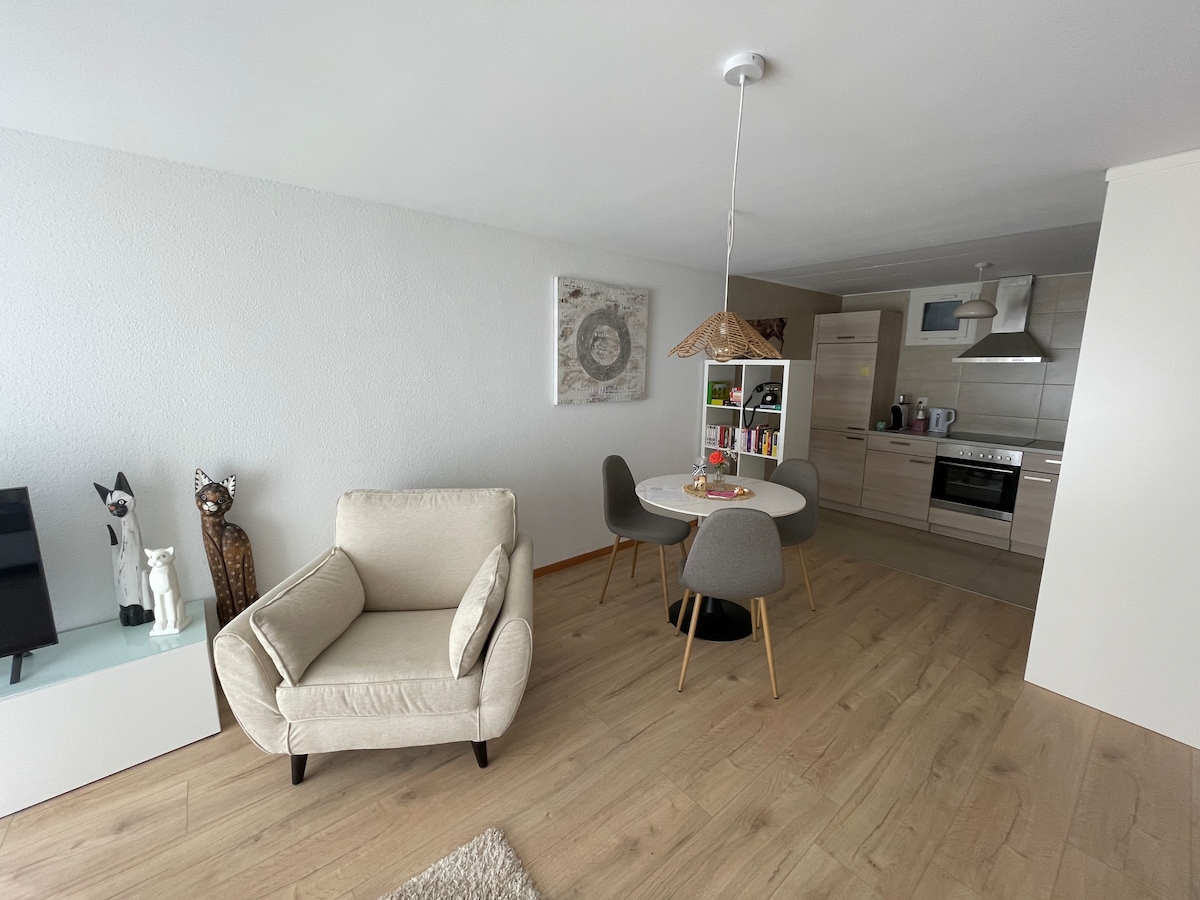 Bright 40m² studio close to nature, centrally located for access to Fribourg, Bern, and Lausanne. 💝 Entrance via private terrace 💝 Free parking, electric car charging station (CHF 20.-) 💝 Shop and SBB train station 900m away ⚠️ From October to April, if the night is cool, the noise of the heat pump may bother you. ⌛️ If your stay exceeds one week, we will need to access our laundry room from the studio, with your prior agreement.