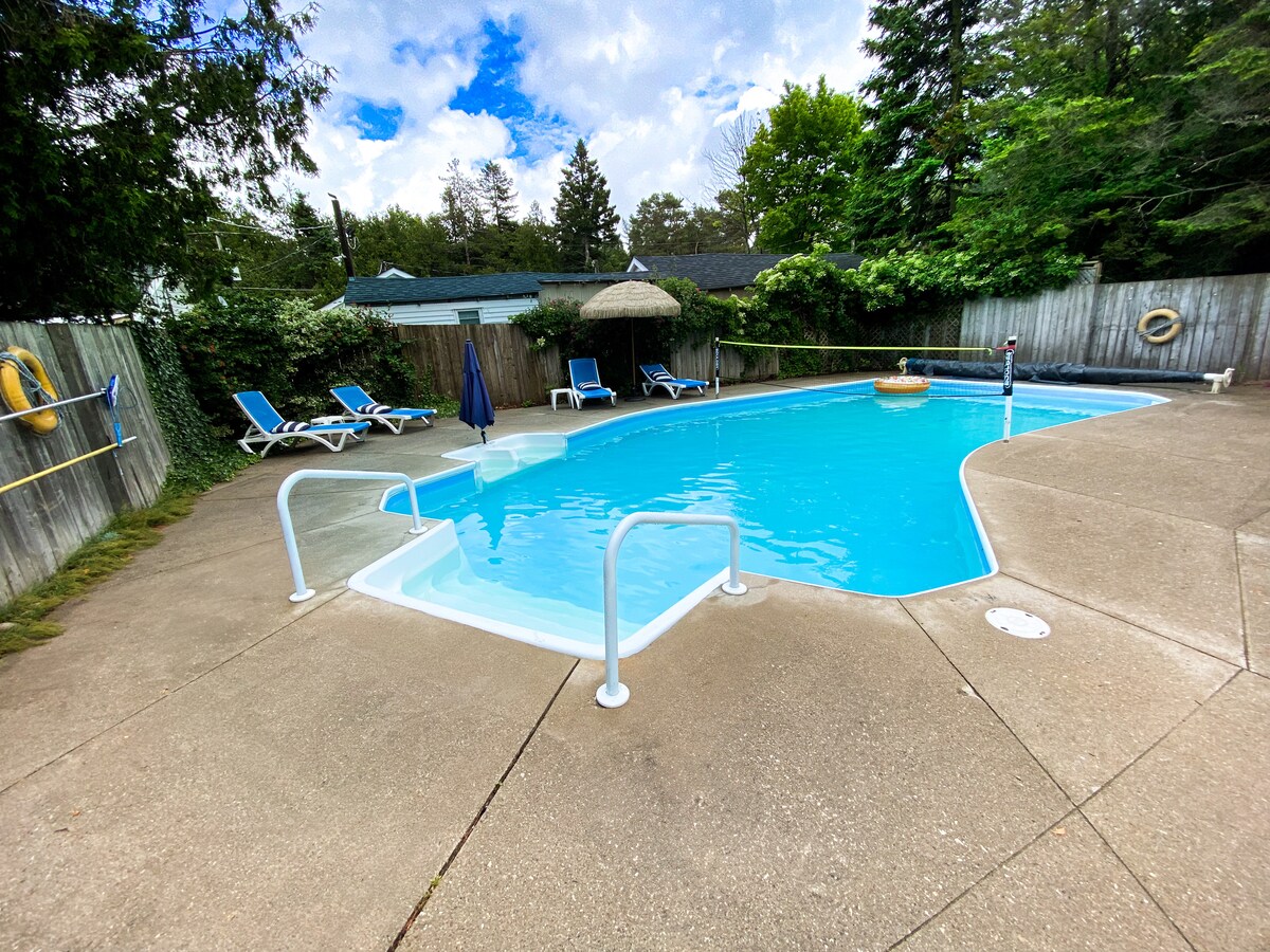 BELIGGENHET!!! 10 minutters spasertur til North Sauble Beach! Dette romslige hjemmet med tre soverom pluss to etasjer (1600 kvadratfot) er godt vedlikeholdt, fullt utstyrt og barnevennlig (to barnesenger). Det er perfekt for familier! Det er en romslig hage for å spille spill (badminton, spike ball, bean bag toss, barnebasseng, strandvogner og stoler, håndklær, parasoller og mange leker! Klimaanlegg på alle soverommene og komfortable senger! Ved og RO-vann er inkludert! Passer for personer med allergi (ingen tepper, ikke-giftige produkter).