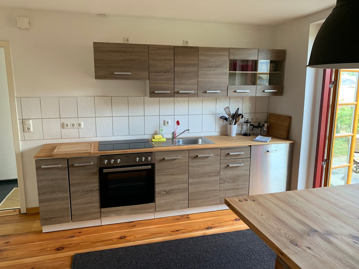 Det nyoppussede feriehuset ligger i landsbyens sentrum i Grünz, omgitt av den vakre Randowtal. Den koselige kjøkkenstuen har peis og sovesofa. Soverommet med tilstøtende terrasse inviterer til å spise frokost og bli værende. Den store engen foran feriehuset er ideell for lek og moro for barn og/eller hunder. I vår vakre region kan du vandre, sykle og nyte naturen i timevis. Den nærliggende innsjøen inviterer til bading, fiske eller båtturer.