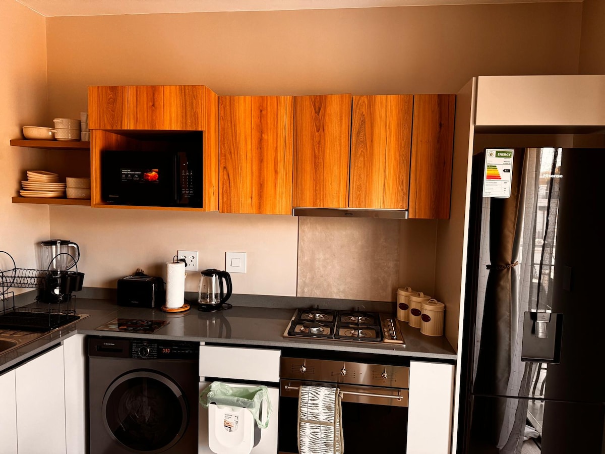 Moderne, sentral beliggenhet i Bryanston. Leiligheten med to soverom og to bad (75 kvm) er designet for å kombinere stil, komfort og bekvemmelighet. Leiligheten har et hovedsoverom med en queensize-seng og eget bad med dusj, et andre soverom med dobbeltseng og gjestebad med badekar, og en åpen stue og spisestue. Fullt utstyrt designerkjøkken gir enkel selvbetjening, smart-TV, med tilgang til Netflix, DSTV, Showmax og Amazon Prime Video (egen innlogging).