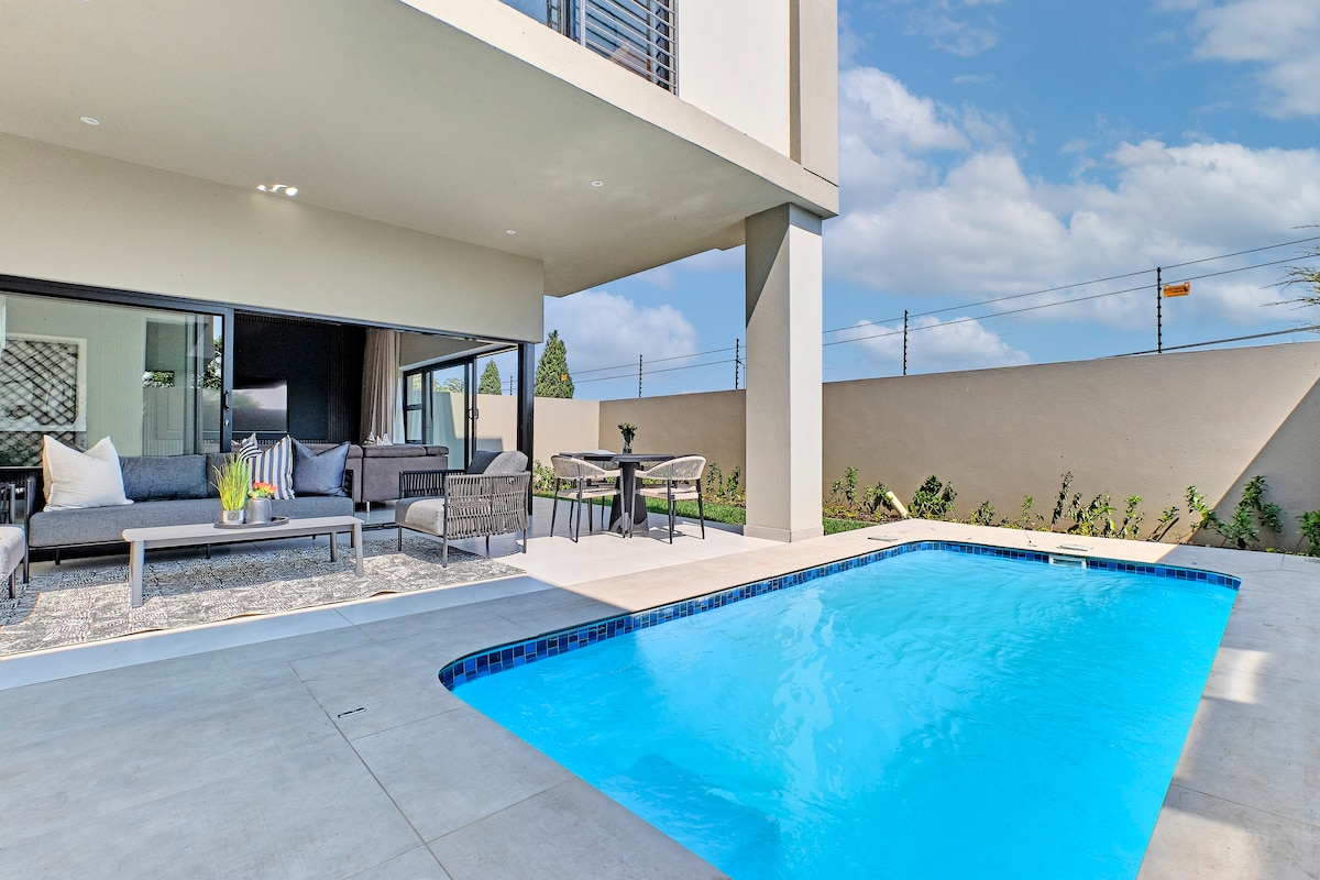 Opplev moderne eleganse i dette moderne hjemmet med tre soverom og eget bad i Bryanston i Sandton. Med elegant design, romslige oppholdssteder, en privat hage og et glitrende basseng, tilbyr den luksus og komfort. Nyt gratis trådløst nettverk med høy hastighet, sikker parkering på stedet, klimaanlegg og en reservevannforsyning – den perfekte blandingen av stil, privatliv og bekvemmelighet. Rene arkitektoniske linjer, smakfulle møbler og rikelig med naturlig lys skaper en atmosfære av eleganse.