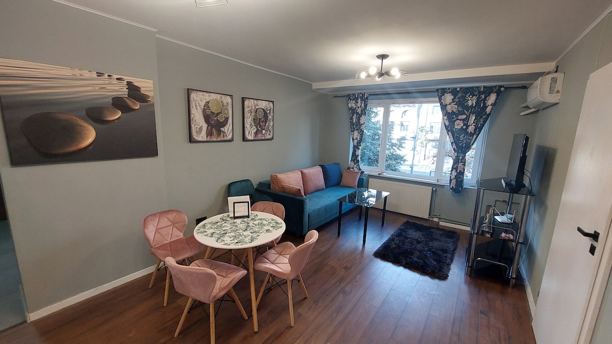 Spacious luxury 40 sqm studio in the heart of Bucharest, just steps from Old Town Bucharest. Recently renovated, the apartment features elegant decor, a comfortable queen-size bed (180×200 cm), a stylish sofa, a cozy balcony, a large fully equipped kitchen and a spacious bathroom with rain shower. Hosted by a Superhost with over 7 years of experience. Metro right next to the building. Coffee shop, cake shop, mini markets, fast food, ATM and currency exchange on the ground floor.