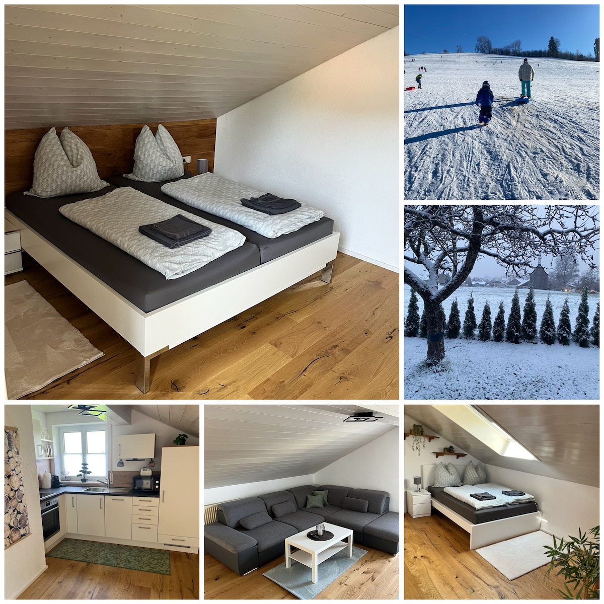 Velkommen til leiligheten vår på Rottachsee i Petersthal. Leiligheten har to rom på ca. 71 kvm. Hele stuen er designet med tregulv. Et velutstyrt kjøkken med kokeplate, stekeovn, kjøleskap, kaffemaskin osv. er tilgjengelig. Vi anbefaler ankomst med bil, siden den nærmeste togstasjonen ligger ca. 8 km unna, og det er ingen offentlig transport på stedet!