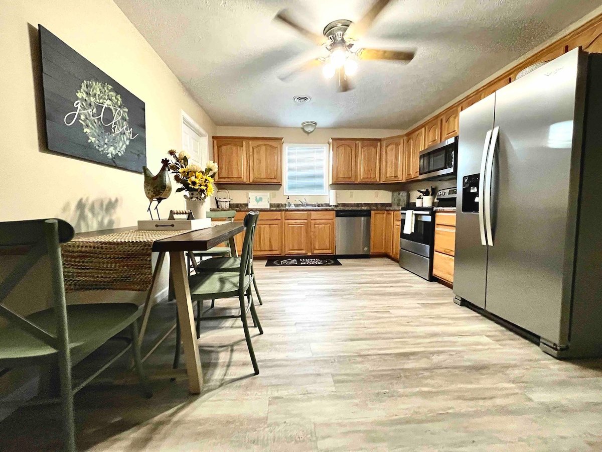 Et innbydende hjem i familiestil med to soverom. Fullt kjøkken/spisestue/stue. Hjemmet har trepaneler og en 1940-talls stemning. Oppdatert hjem for fire generasjoner. Fullt fungerende kjøkken med stort kjøleskap, komfyr, mikrobølgeovn og kaffemaskin. Vaskerom utenfor spiseområdet, privat innkjørsel, bakgården har kullgrill og bålplass. Vakkert, rolig nabolag nær Rend Lake. Jakt, fiske, golf, strender innen 5 miles.