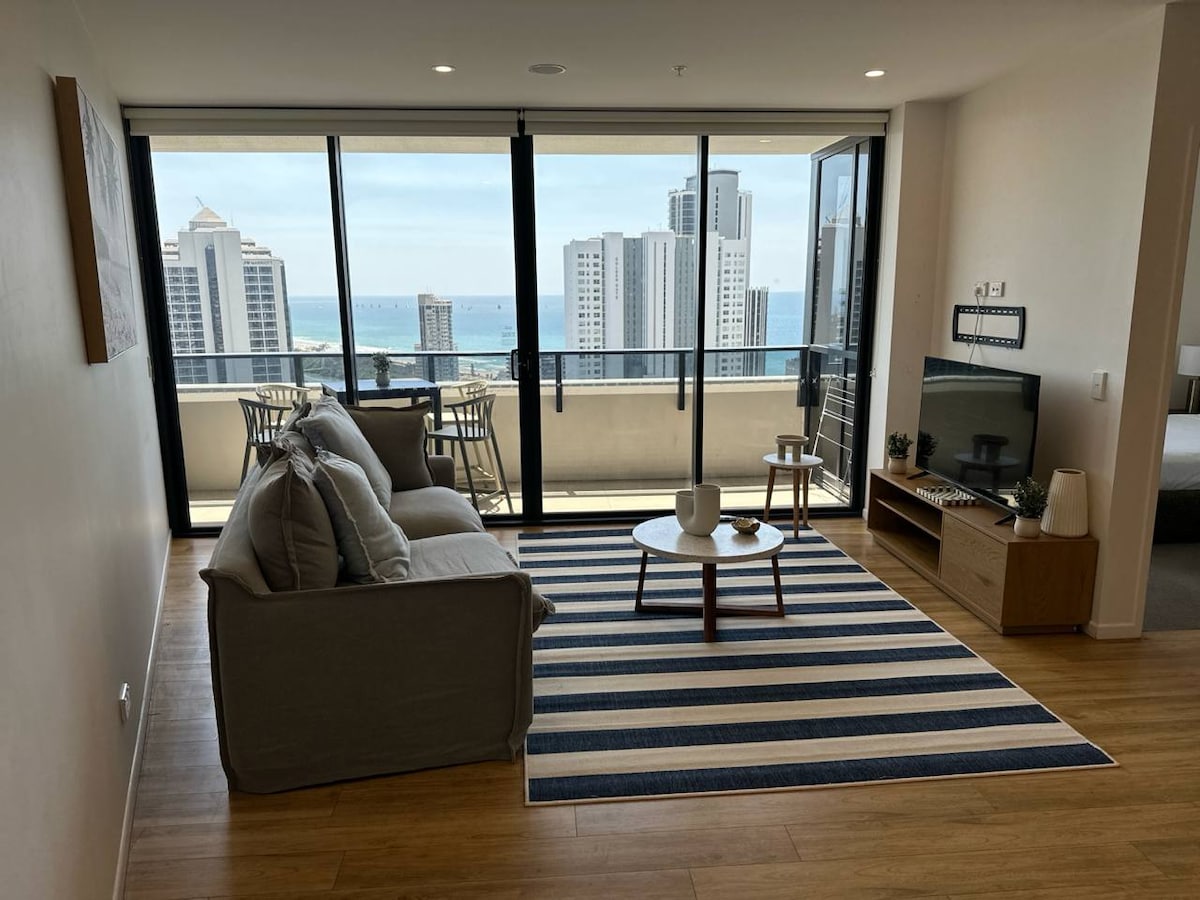 Leilighet ved stranden i en høy etasje med vinduer fra gulv til tak, privat balkong med fantastisk havutsikt og tilgang til Surfers Paradise-stranden rett over veien. Leiligheten har en kingsize-seng på soverommet og en dobbel sovesofa i stuen. Fullt utstyrt kjøkken, trådløst nettverk med høy hastighet, klimaanlegg, TV-er med Netflix og YouTube, gratis parkering og komplett privat vaskeri. Gjester har tilgang til treningsstudio, spa, sauna, basseng og griller i nærheten av bassenget og på taket.
