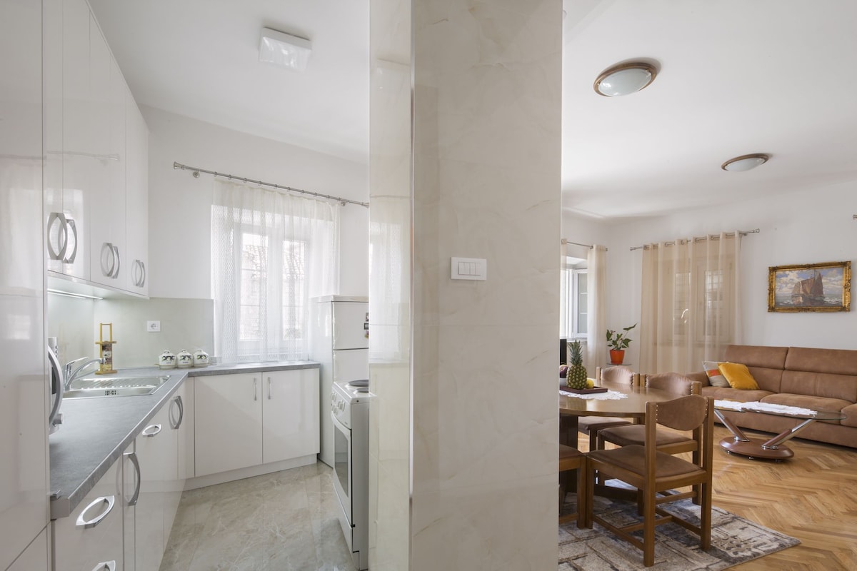 Hyggelig og fredelig leilighet for par. Den har terrasse med havutsikt og behagelige omgivelser med vakker hage. 5 minutter unna gamlebyen, strender,restauranter og barer ligger i nærheten. Den har ett soverom, ett bad og en stue med kjøkken. Du kan nærme deg leiligheten fra to sider, fra Gospostina-gaten (Primorski Bataljon) og fra Jadranski put, som ligger over huset.